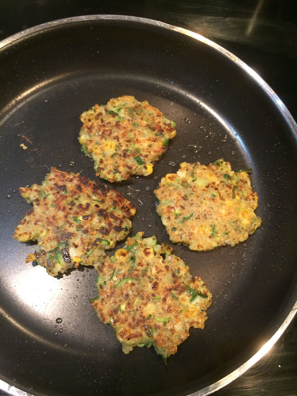 Most of the time, I scroll through Pinterest for meal ideas when my fridge is full of veggies. I was inspired to make my own version of VEGGIE FRITTERS: shredded zucchini, corn, basil, Italian seasoning, salt, freshly ground pepper, quinoa, nutritional yeast, egg, chia seeds, ground flax, and potato starch. Once cooked, top with LEMON AIOLI: lemon juice, garlic, (vegan) mayo (use mini food processor or blender).